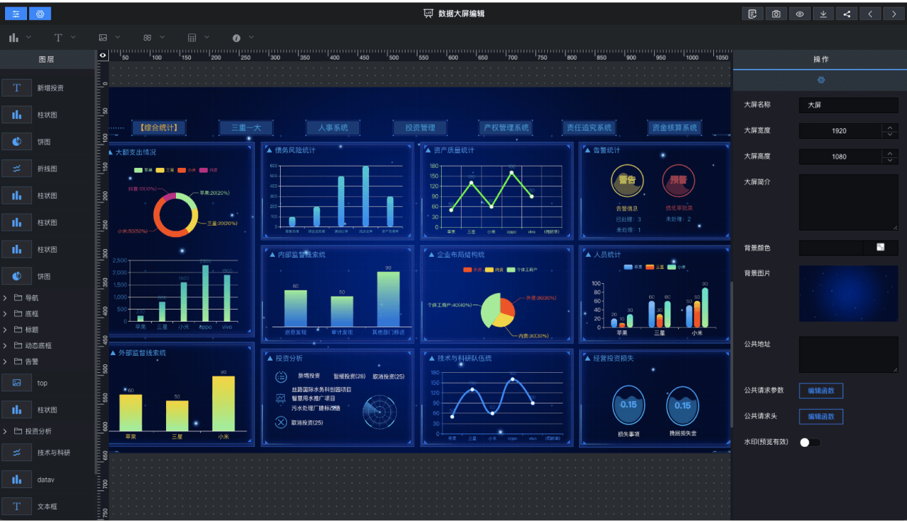 包含数据可视化管理和数据大屏编辑器等无代码生成工具。极大降低生成数据报表门槛。